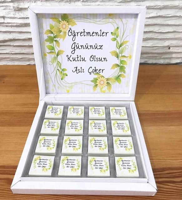 -32 adet madlen çikolata mevcuttur -Çikolata üzerinde Öğretmenler Gününüz Kutlu Olsun (isim) yazmaktadır -Çikolata markası melodidir. -Çikolata ölçüsü 4×4 cm dir -Kutu ölçüsü 23 cm x 22 cm dir.